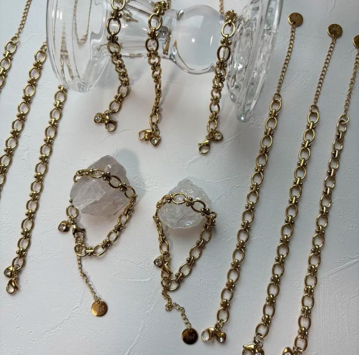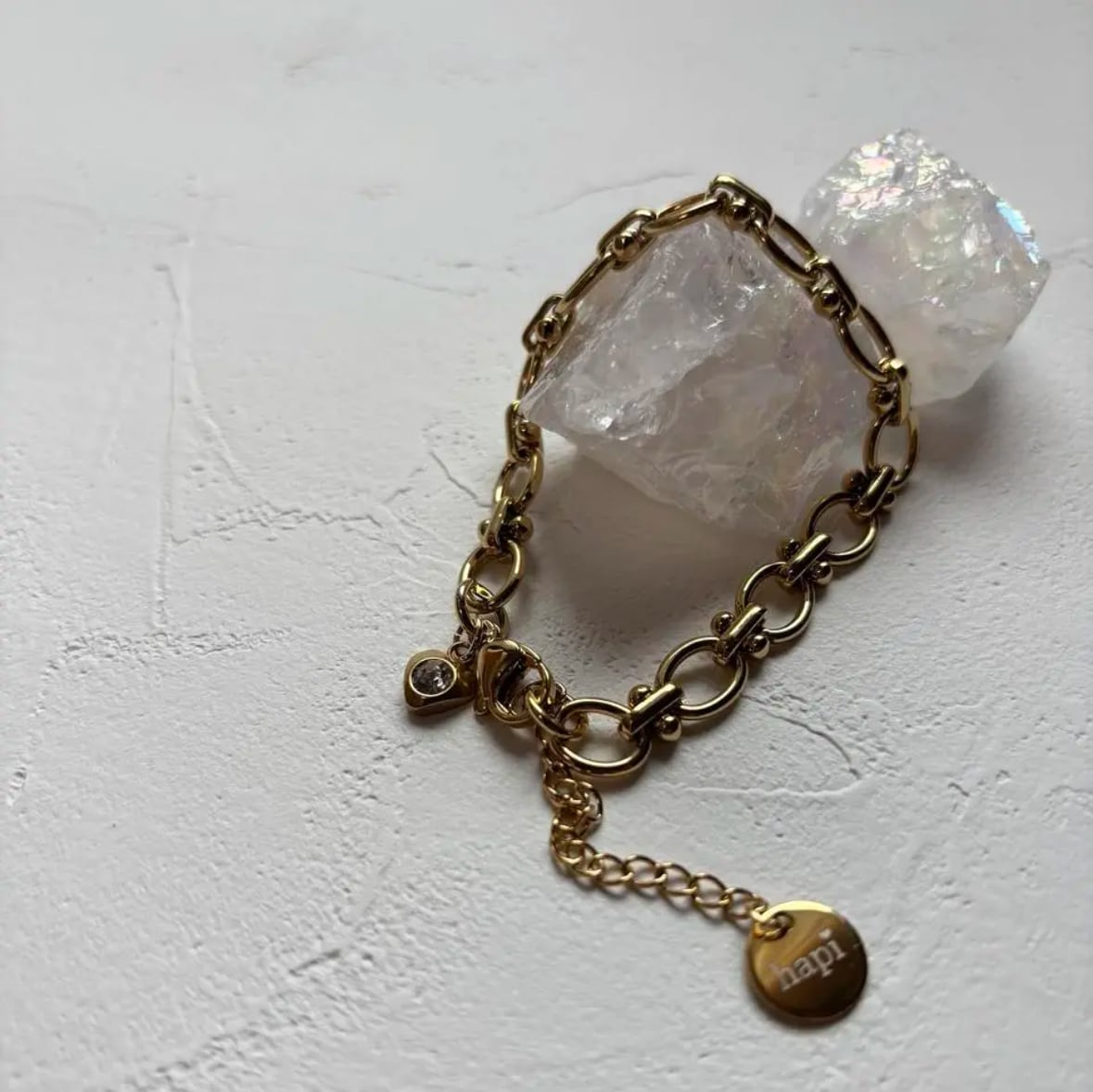 hapiロゴチャームと小さなハートビジューを添えた